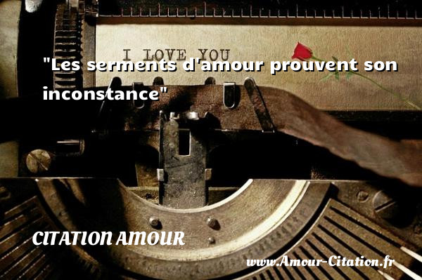 Les serments d’amour prouvent Publié le 8 novembre 2010 à 05:50 Mis à jour le 15 juillet 2022 à 12:44Par PaulDans Amour, Citation Amour 4.3/5 - (6 votes) Les serments d’amour prouvent son inconstance Une citation d’amour Sommaire Toggle Lire aussi:Qui cherche l'amour l'aura.Si vous croyez en l'amour,Tous les trésors de la terreUne poésie, c'est un sourire Lire aussi:Vivre sans toi, c'est mourirVivre sans toi ça sert à quoiJe te laisse sur la pointe deL'amour c'est comme le