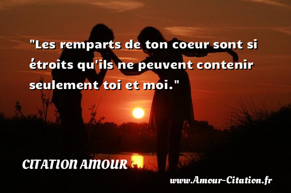 Les remparts de ton coeur Publié le 8 novembre 2010 à 04:14 Mis à jour le 15 juillet 2022 à 11:53Par PaulDans Amour, Citation Amour 4.7/5 - (6 votes) Les remparts de ton coeur sont si étroits qu’ils ne peuvent contenir seulement toi et moi. Une citation d’amour Sommaire Toggle Lire aussi:Tu es si près de moi pourtantL'amour est comme uneDans l'amour et dans lesL'amour a besoin de Lire aussi:Quand on aime le jour de sonNotre amour est ma tumeur,Ce n'est pas tout d'êtreLes gueux ne sont point