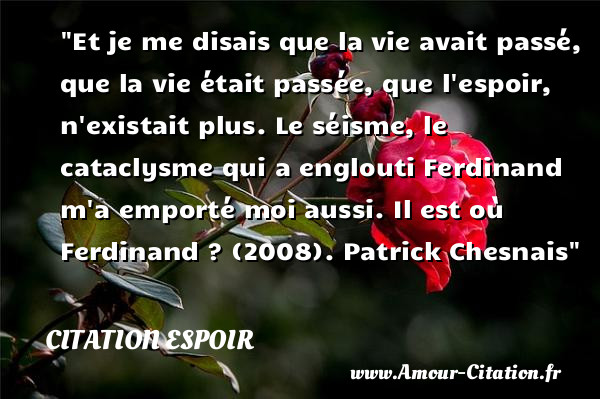 Et je me disais que la vie avait passé, que la vie était passée, que l’espoir, n’existait plus. Le séisme, le cataclysme qui a englouti Ferdinand m’a emporté moi aussi.