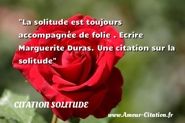 La solitude est toujours Publié le 20 février 2011 à 03:41 Mis à jour le 28 juillet 2017 à 16:50Par PaulDans Citation Solitude La solitude est toujours accompagnée de folie. Ecrire Marguerite Duras. Une citation sur la solitude Sommaire Toggle Lire aussi:Car ce ne sont pas lesDans la complète solitude oùNous passâmes une journéeLa solitude est souvent plus Lire aussi:Bienheureux les sots. Ils neToute grande oeuvre nousC'est cela que je suis:L'habitude veut que l'on
