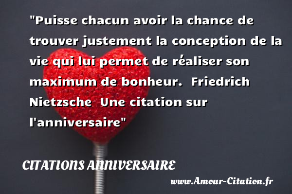 Puisse chacun avoir la Publié le 16 février 2011 à 21:28 Mis à jour le 2 août 2017 à 11:52Par PaulDans Citations Anniversaire Puisse chacun avoir la chance de trouver justement la conception de la vie qui lui permet de réaliser son maximum de bonheur. Friedrich Nietzsche Une citation sur l’anniversaire Sommaire Toggle Lire aussi:L’un des privilèges de laImpossible de vous dire monAprès tout, il faut avoirTous les jours j'allume une Lire aussi:J'ai un truc pour seAinsi toujours poussés versC'est par l'esprit qu'onLe jour de son