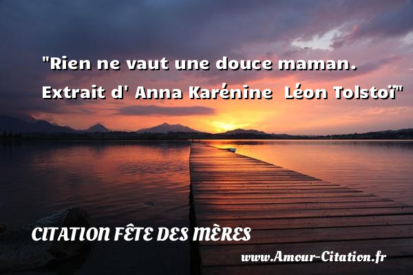Rien ne vaut une douce maman. Publié le 12 mai 2011 à 02:24 Mis à jour le 11 janvier 2016 à 16:46Par PaulDans Citation fête des Mères, Fête des Mères Rien ne vaut une douce maman. Extrait d’ Anna Karénine Léon Tolstoï Une citation fête des Mères Sommaire Toggle Lire aussi:On ne peut pas essayerOn se croit toujours plusQuand les stars fêtent les mamans…Rien ne vaut une douce maman. Lire aussi:A une maman on ne ment pas.Si jeune que l'on soit, leOn est de son enfance commeFragile beauté maternelle où